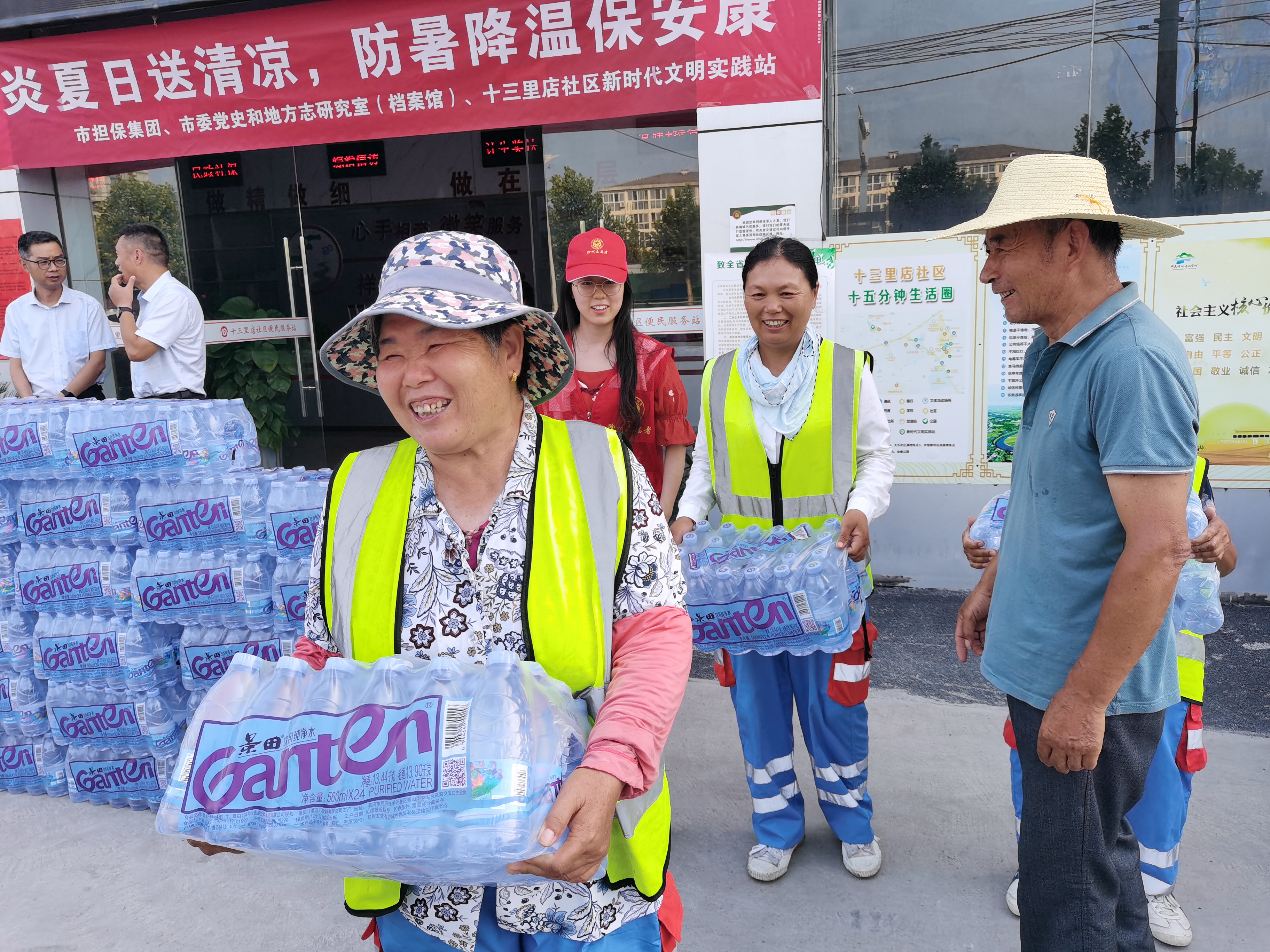 環(huán)衛(wèi)工人們開(kāi)心的收到防暑降溫物品