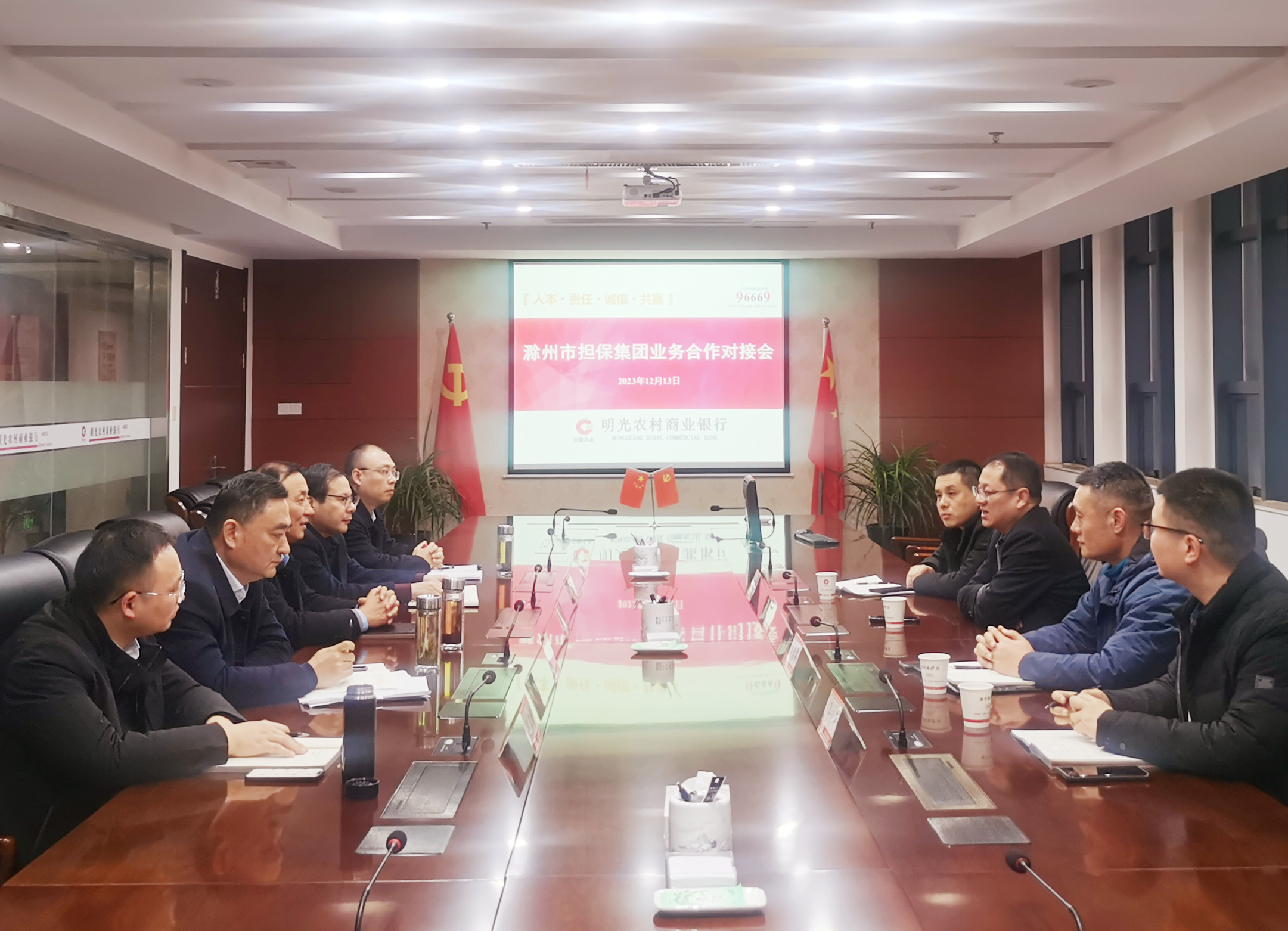12月13日,市擔(dān)保集團(tuán)黨委委員、副總經(jīng)理張健帶隊前往明光農(nóng)商行開展業(yè)務(wù)交流,明光農(nóng)商行董事長任路明及相關(guān)領(lǐng)導(dǎo)參加座談。
