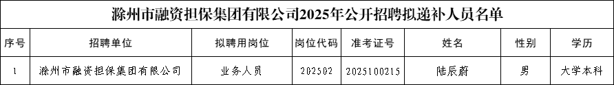 根據(jù)《滁州市融資擔(dān)保集團有限公司2025年公開招聘工作人員公告》相關(guān)規(guī)定,經(jīng)報名、資格審查、筆試、面試、體檢、考察等招聘程序,現(xiàn)將擬遞補人員予以公示。